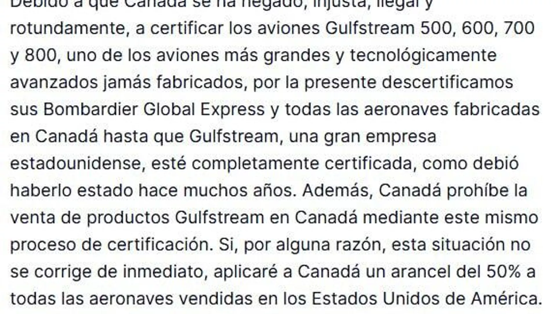 El presidente estadounidense Donald Trump advirtió con aplicar un gravamen del 50% sobre las aeronaves fabricadas en Canadá y vendidas en EEUU, luego de que Ottawa se negara a certificar los aviones Gulfstream 500, 600, 700 y 800, de manufactura estadounidense.