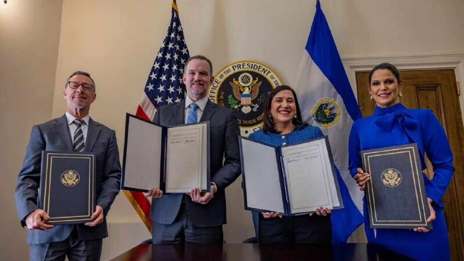 El representante comercial estadounidense, Jamieson Greer, y la ministra de Economía salvadoreña, María Luisa Hayem, firmaron el Acuerdo entre EEUU y El Salvador sobre Comercio Recíproco, en el que se incluye la eliminación del arancel de 10% a las importaciones del país centroamericano.