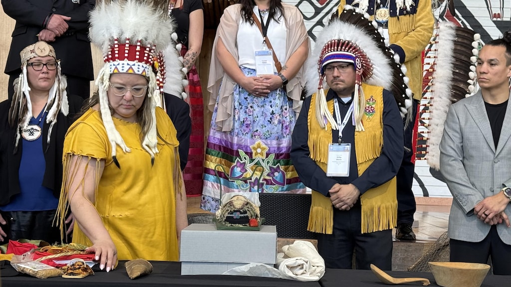 Varios dignatarios y líderes indígenas, incluida Cindy Woodhouse Nepinak, participaron en la presentación de objetos sagrados repatriados del Vaticano a principios de este invierno.