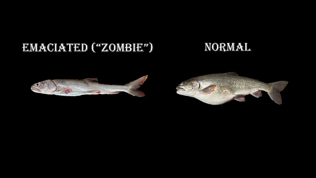 Se han encontrado truchas llamadas siscowet, una especie de trucha de aguas profundas, anormalmente delgadas, hasta un 40 o 50 por ciento más pequeñas de lo normal. Su aspecto es tan inusual que los investigadores las han apodado truchas zombis
